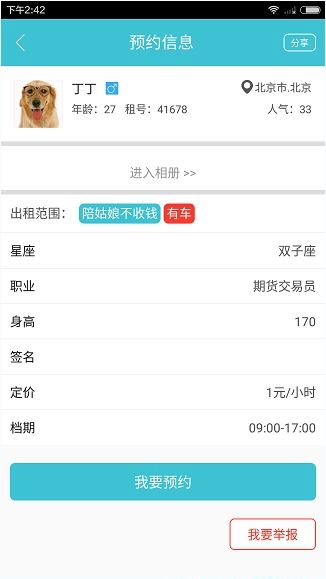 2、看他的预约信息后,点击下方的“我要预约”。