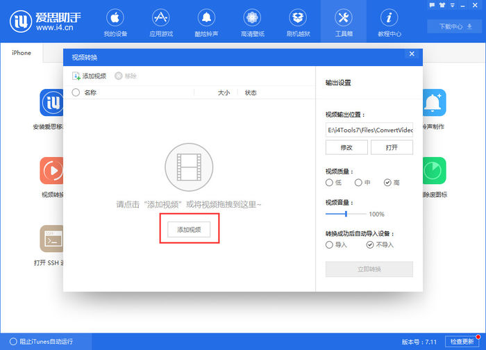 一、打开爱思助手 PC 端,点“工具箱-视频转换”进入视频转换界面;