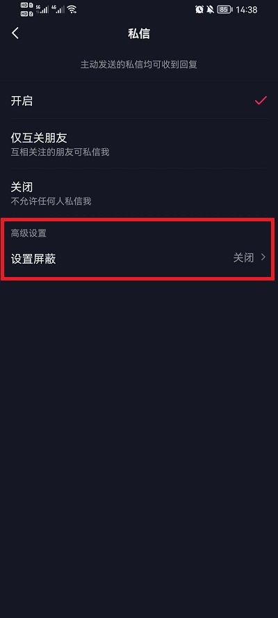 5、在私信界面中就可以看到下方的【设置屏蔽】点击打开;