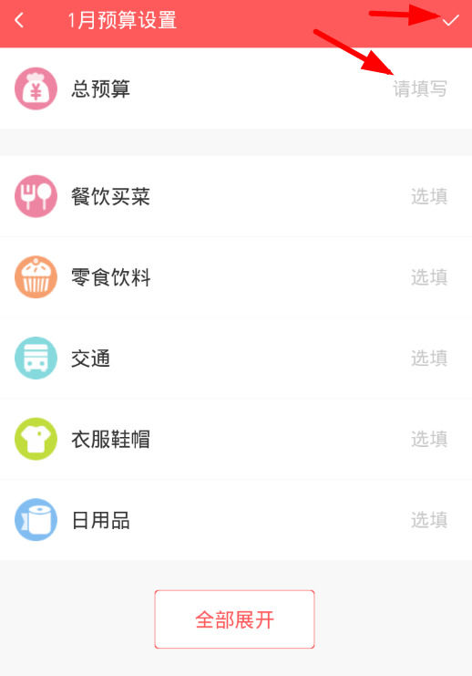 3、在其中你不仅能够直接设置这个月预算的总额,还能细分到各个消费点上,让你能够更精准的了解消费情况,设置金额完毕后点击右上角对勾。